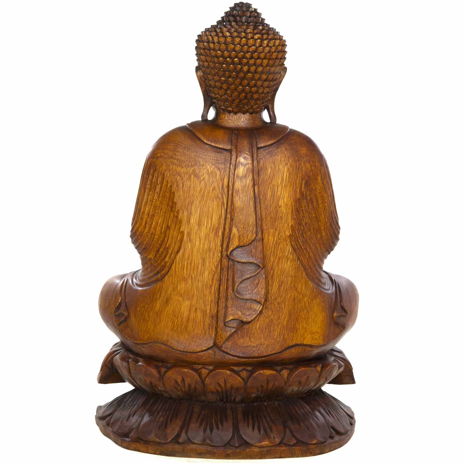 This 80cm seated Buddha has been carefully and expertly hand carved on the island of Bali. Each of these incredible works of art is created from a solid piece of suar wood. When depicting Buddha, the positioning of the hands (Mudra) is very important and different mudra represent different things. Here, Buddha is shown with his hands in the Anjali mudra ('prayer hands') and this represents respect, greeting, reverence and devotion. The position (Asana) for seated Buddhas is often this full lotus position with the feet resting on the thigh of the other leg and the soles facing upwards. This meditative asana is known as Dhyana Asana or Padmasana. As this item is both large and heavy, collection from our warehouse is preferred. We may be able to send direct, please contact us for shipping prices and information if you are interested