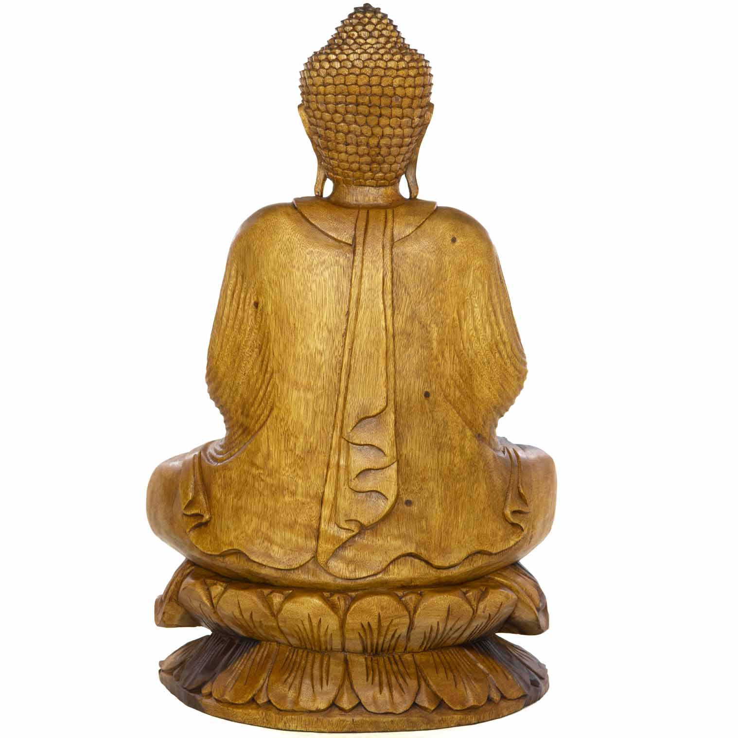 This 80cm seated Buddha has been carefully and expertly hand carved on the island of Bali. Each of these incredible works of art is created from a solid piece of suar wood. When depicting Buddha, the positioning of the hands (Mudra) is very important and different mudra represent different things. Here, Buddha is shown with his hands in the Anjali mudra ('prayer hands') and this represents respect, greeting, reverence and devotion. The position (Asana) for seated Buddhas is often this full lotus position with the feet resting on the thigh of the other leg and the soles facing upwards. This meditative asana is known as Dhyana Asana or Padmasana. As this item is both large and heavy, collection from our warehouse is preferred. We may be able to send direct, please contact us for shipping prices and information if you are interested