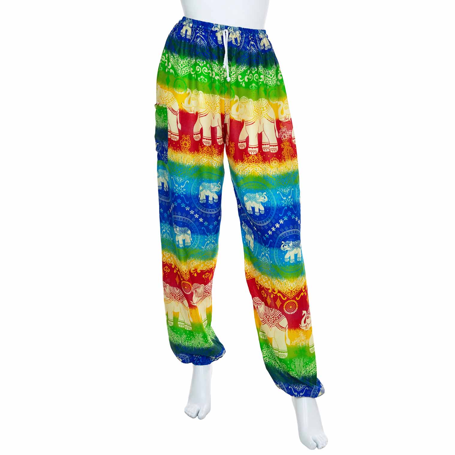 Combining our two favourites - rainbows and elephant print! An elasticated and drawstring waistband gives extra comfort to these vibrant trousers. They also have two handy two side pockets and elasticated ankles.