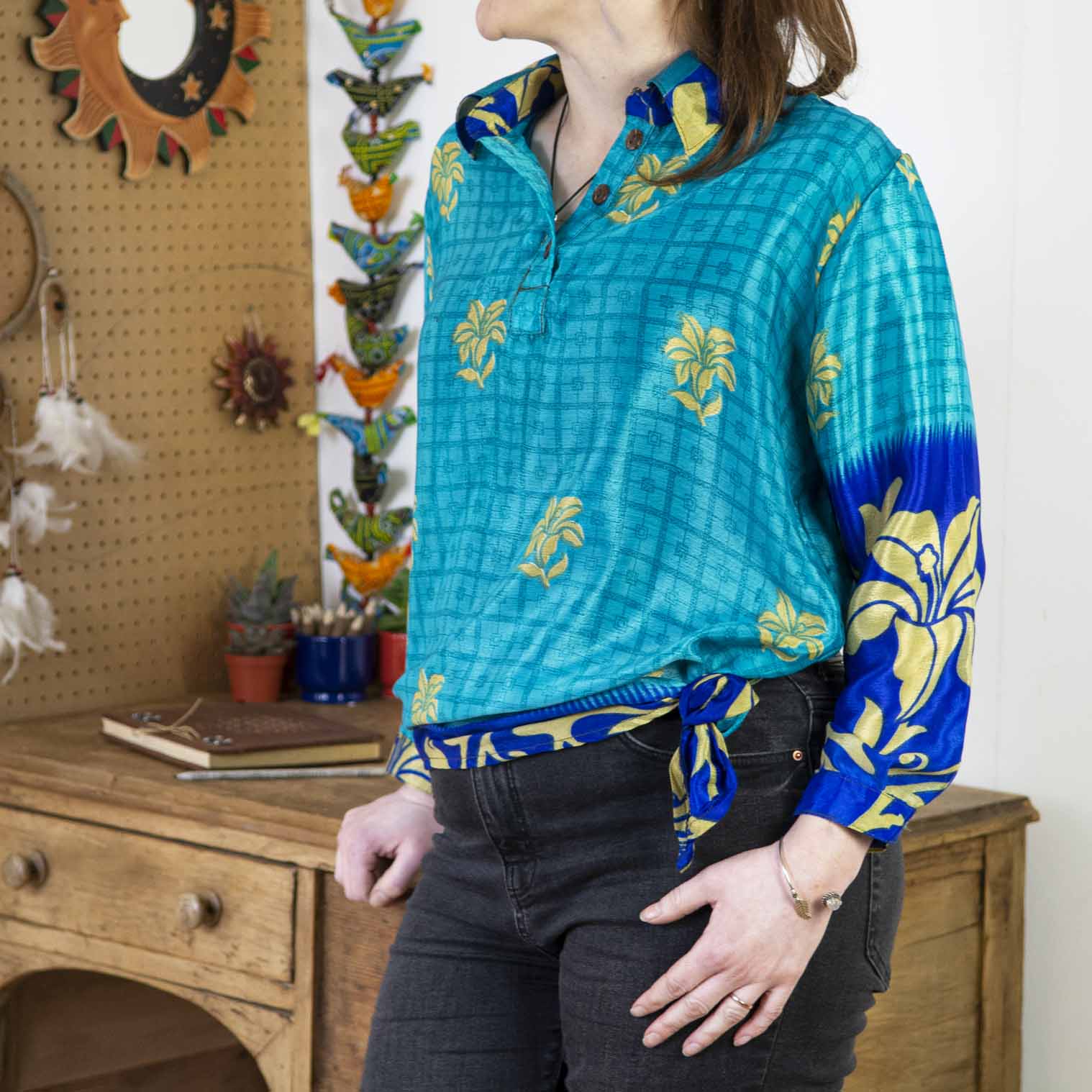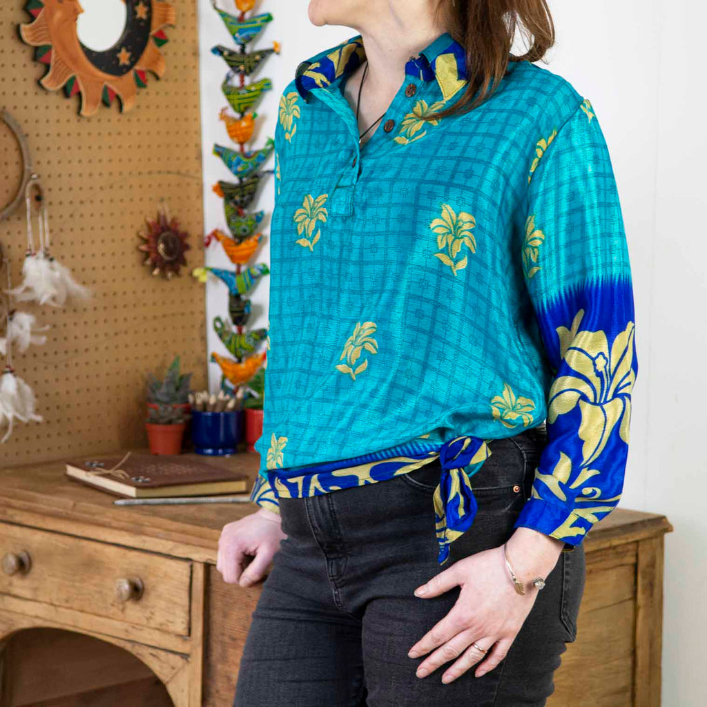 These beautiful ladies shirts have a tailored collar and cuffs but have a quirky hemline that makes for versatile styling - wear it loose or tied for a more boho look. Each one is unique due to their recycled sari nature but that just makes them even more special!