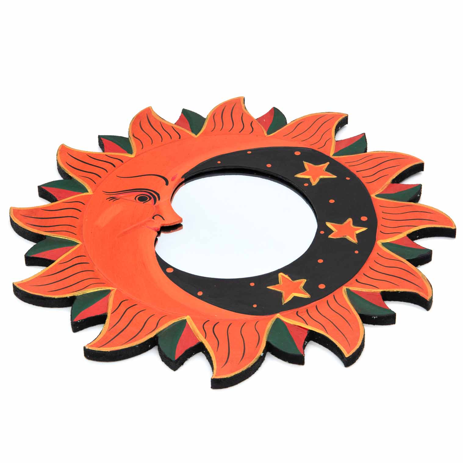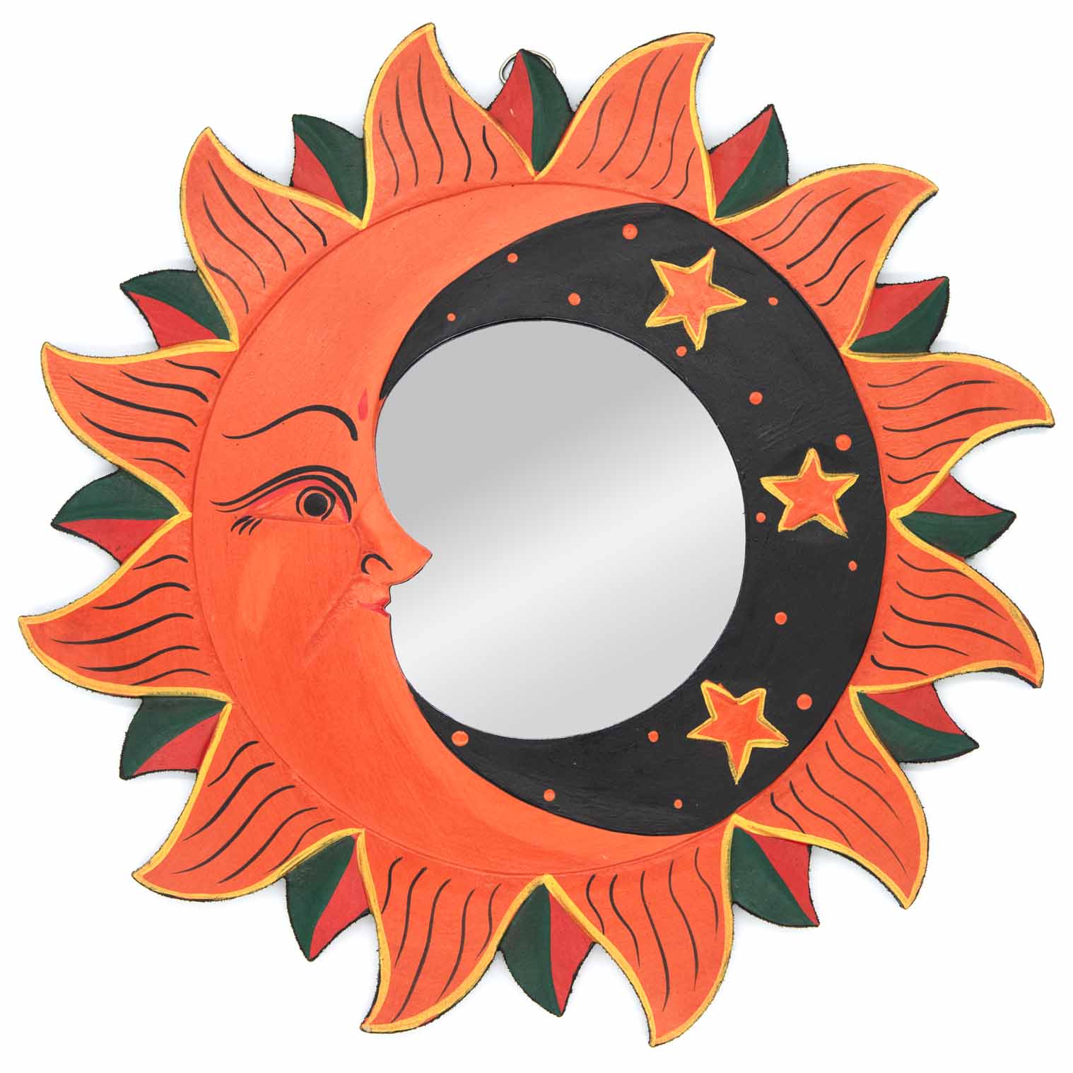These beautiful hand carved mirrors depict the sun and moon with splendid gold detailing. Each mirror has a metal hoop on the reverse for ease of hanging.