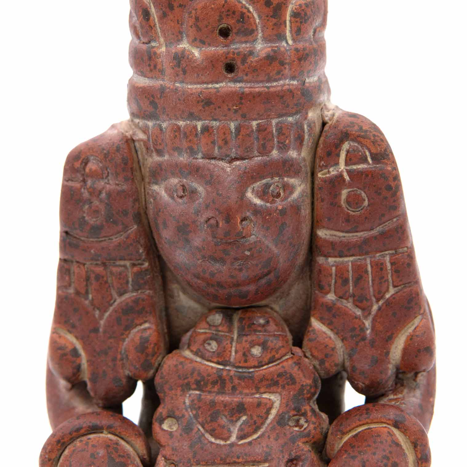 This traditional style ceramic figure is thought to represent a deity from the ancient Zapotec culture, a civilisation said to have survived in various forms over a thousand years, and once located in what is now central Mexico. The pre-Colombian figure is depicted seated cross-legged and due to its hollow design, thought to have been potentially used as a urn.
