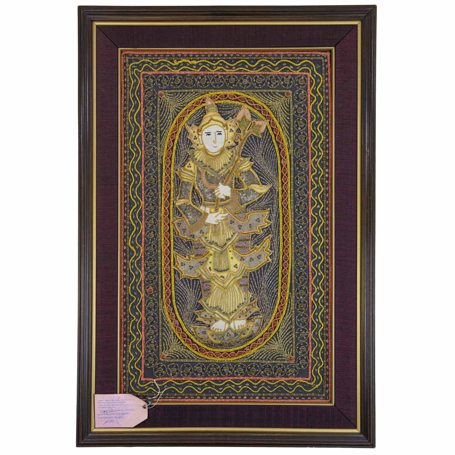 This beautiful kalaga tapestry depicts Thagyamin, the highest ranking nat in traditional Burmese Buddhist belief. A nat is a god-like spirit believed to be either a human that was defied after death, or spirits of nature. This particular nat, Thagyamin, is considered as the King of Heaven, as well as the god of lightning, thunder and rain. He is the Burmese adaptation of the Hindu deities Indra. Here he is shown holding a yak-tail fly-whisk, known as a chowri or chamara, which is a symbol of his royal power and divine status.