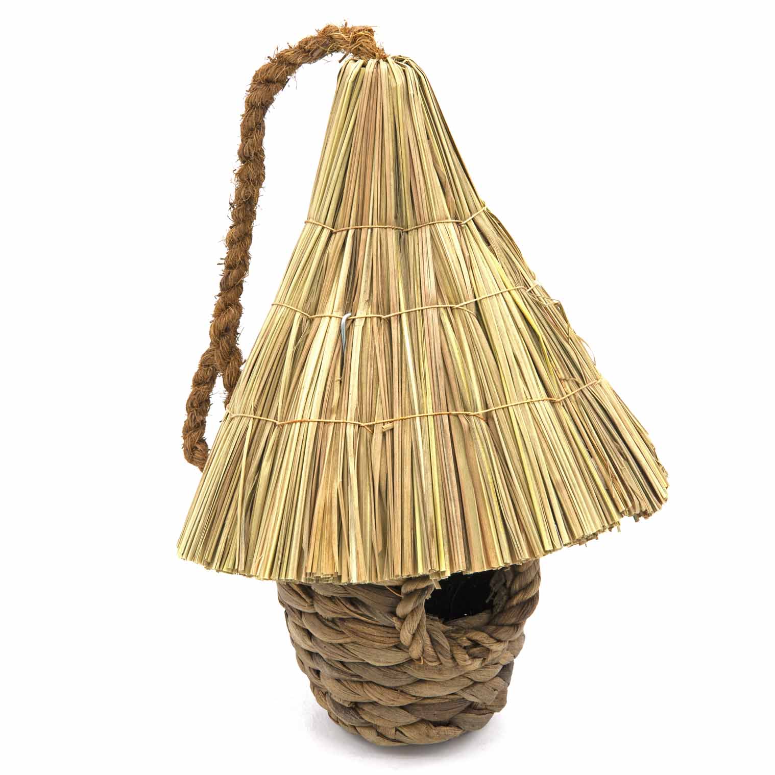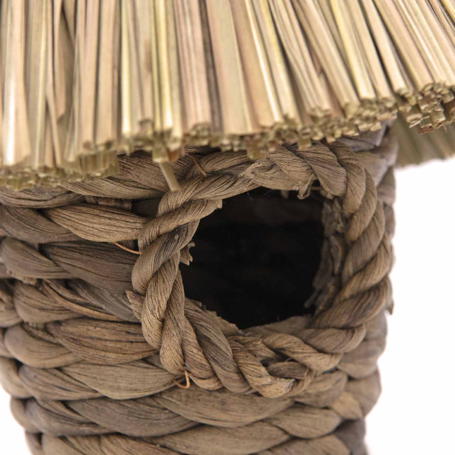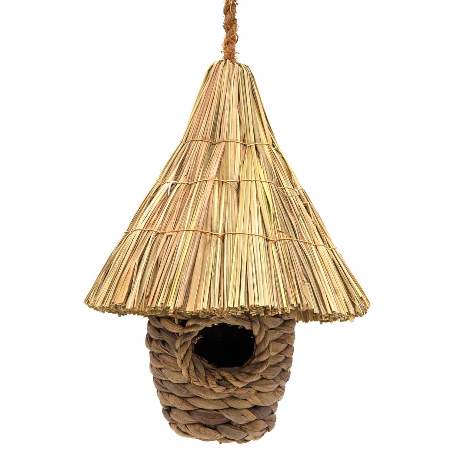 Crafted from woven seagrass with a rattan roof using traditional techniques, each bird box has its own unique character from the natural fibres and rustic finish. The simple, functional design provides the perfect nesting environment while the weathered aesthetic adds charm to your outdoor space.