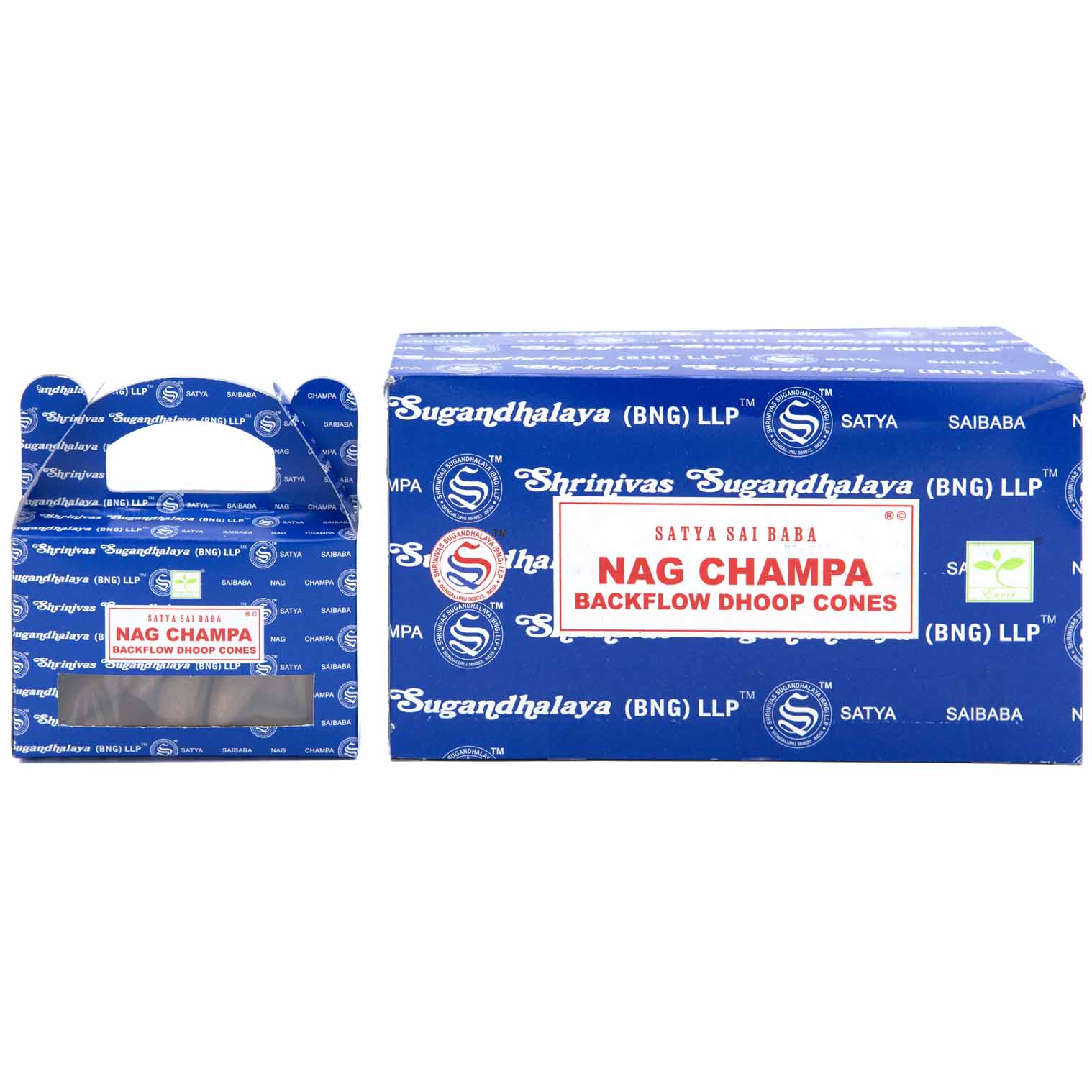 Made by one of the most popular incense manufacturers in the world, these special Nag Champa incense cones are sure to amaze and soothe with their delicious scent and mesmerising smoky backflow. Make sure to use with a backflow burner for the best effects and allow up to ten minutes of burning time for the cones to reach their optimal misty backflow level. 24 cones per pack. 6 packs in a wholesale box.