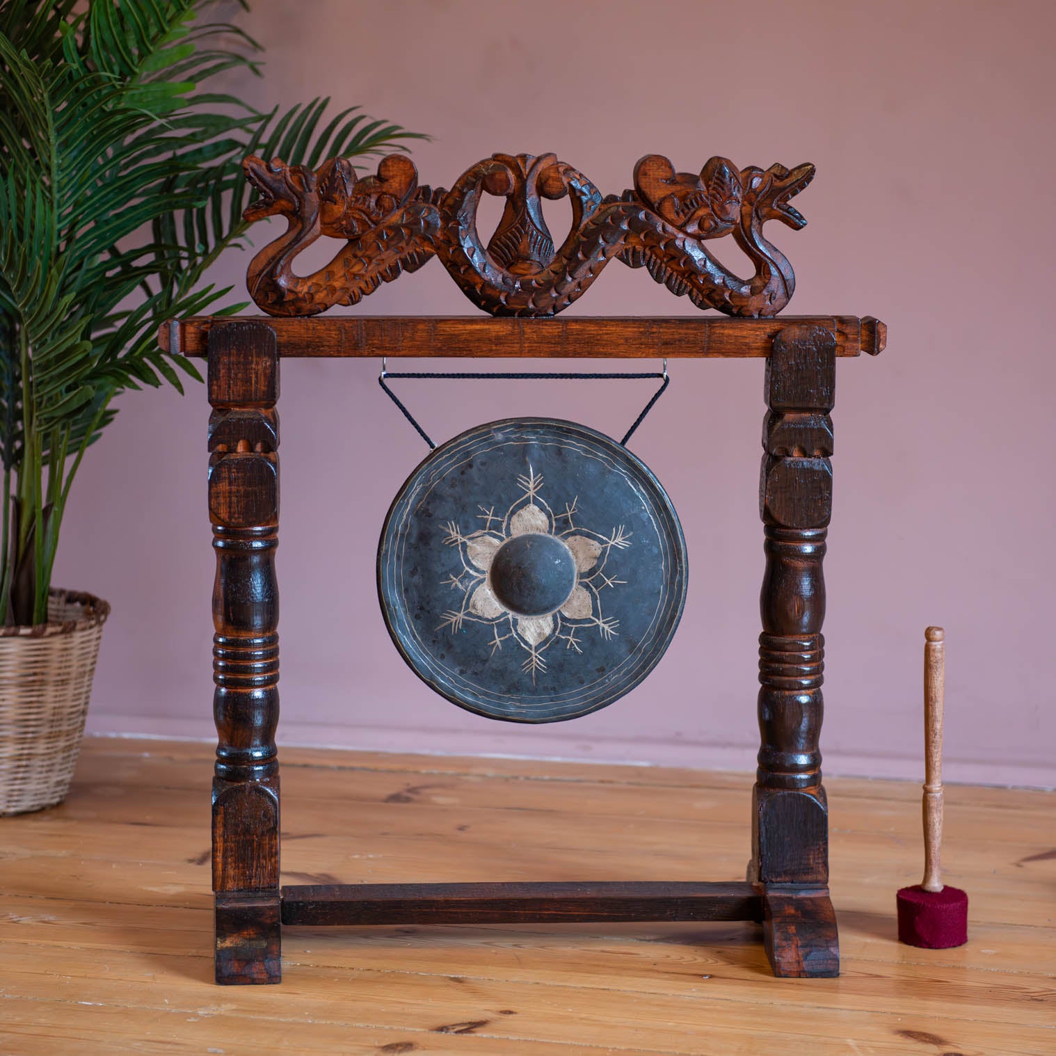 These lovely black Burmese style gongs are often referred to as 'nipple' gongs for the raised boss or nipple in the centre. By striking either the nipple or the gong surrounding it, two different tones can be played. This style of gong is used in Buddhist temples of Southeast Asia and the sound is wonderfully evocative. Unique item. There is only one of these available.