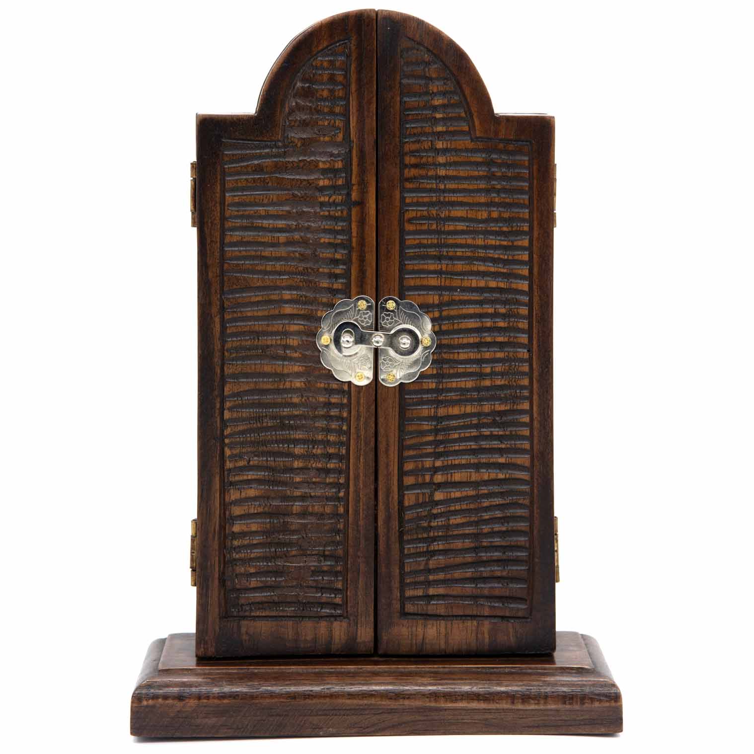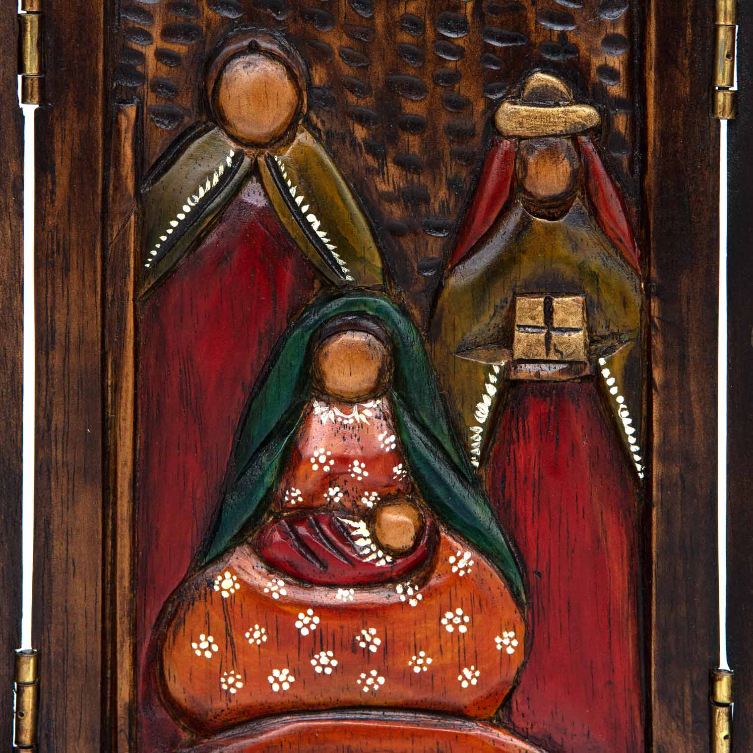 This stunning hand-carved wooden triptych brings the nativity story to life in warm, rustic tones. Depicting Mary, Joseph, and the baby Jesus surrounded by the three wise men, the piece unfolds like a miniature altar scene, perfect for display at Christmas or as a year-round symbol of faith. The hinged side panels open to reveal the detailed carving within, creating a beautiful sense of depth and reverence.