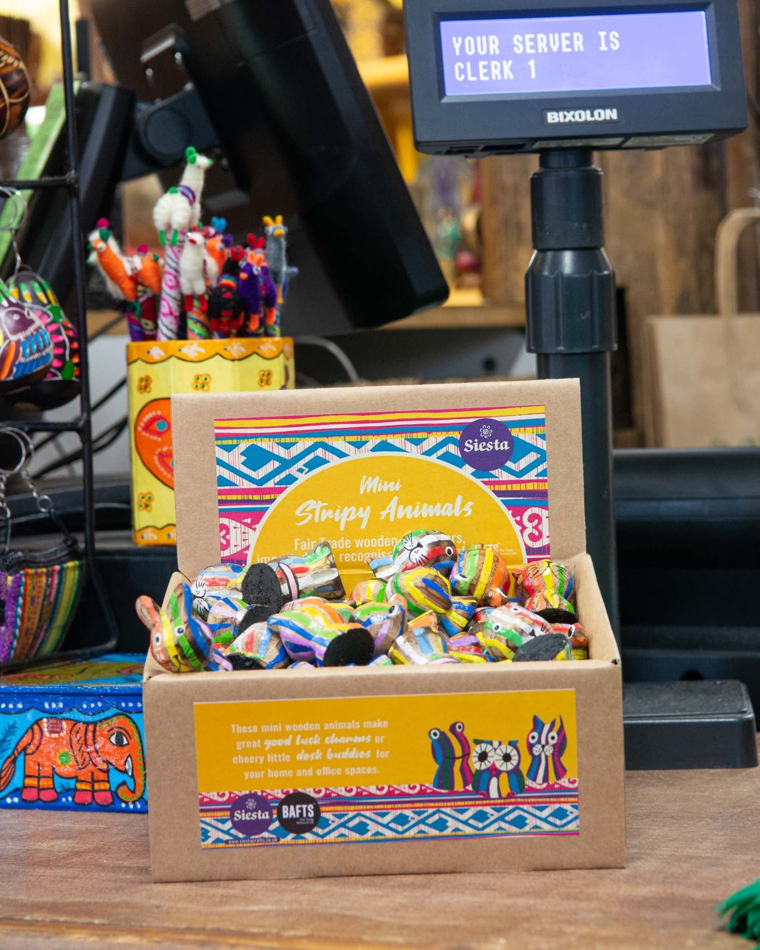 Our range of stripy animals now come in a handy 'ready to display' Point of Sale box! The boxes contain a mix of owls, cats, frogs, puppies and rabbits. Each box is decorated with an eye-catching and vibrant pattern inspired by the traditional prints of the origin country. This is a smaller size to our original Point of Sale boxes which makes it super handy for small spaces, especially on markets stalls and at festivals.