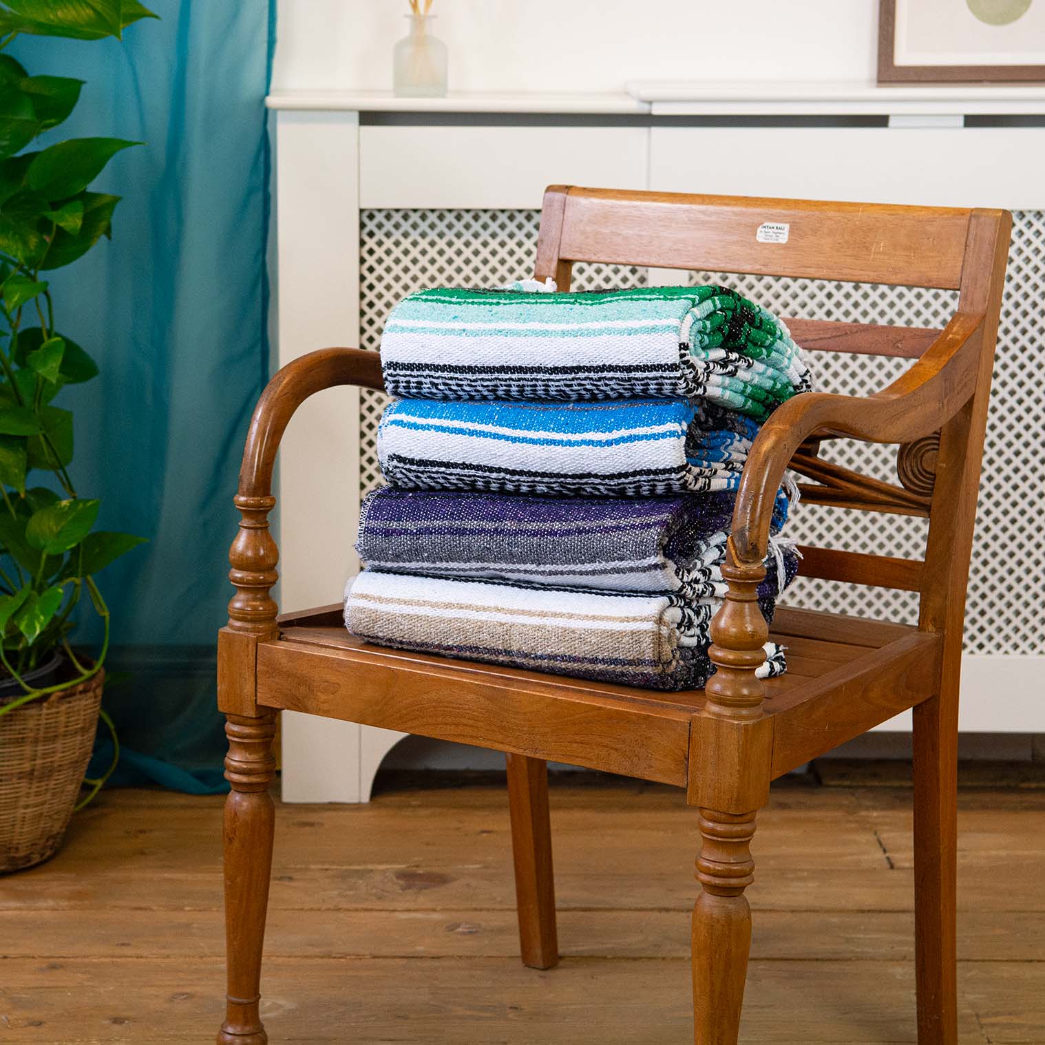 Add colour, comfort, and character to your home or adventures with our traditional Mexican Falsa Blanket. Handwoven using recycled fibres, these classic striped throws are lightweight, versatile, and full of bohemian soul. Perfect for beach trips, yoga sessions, camper vans, or just brightening up your sofa.
