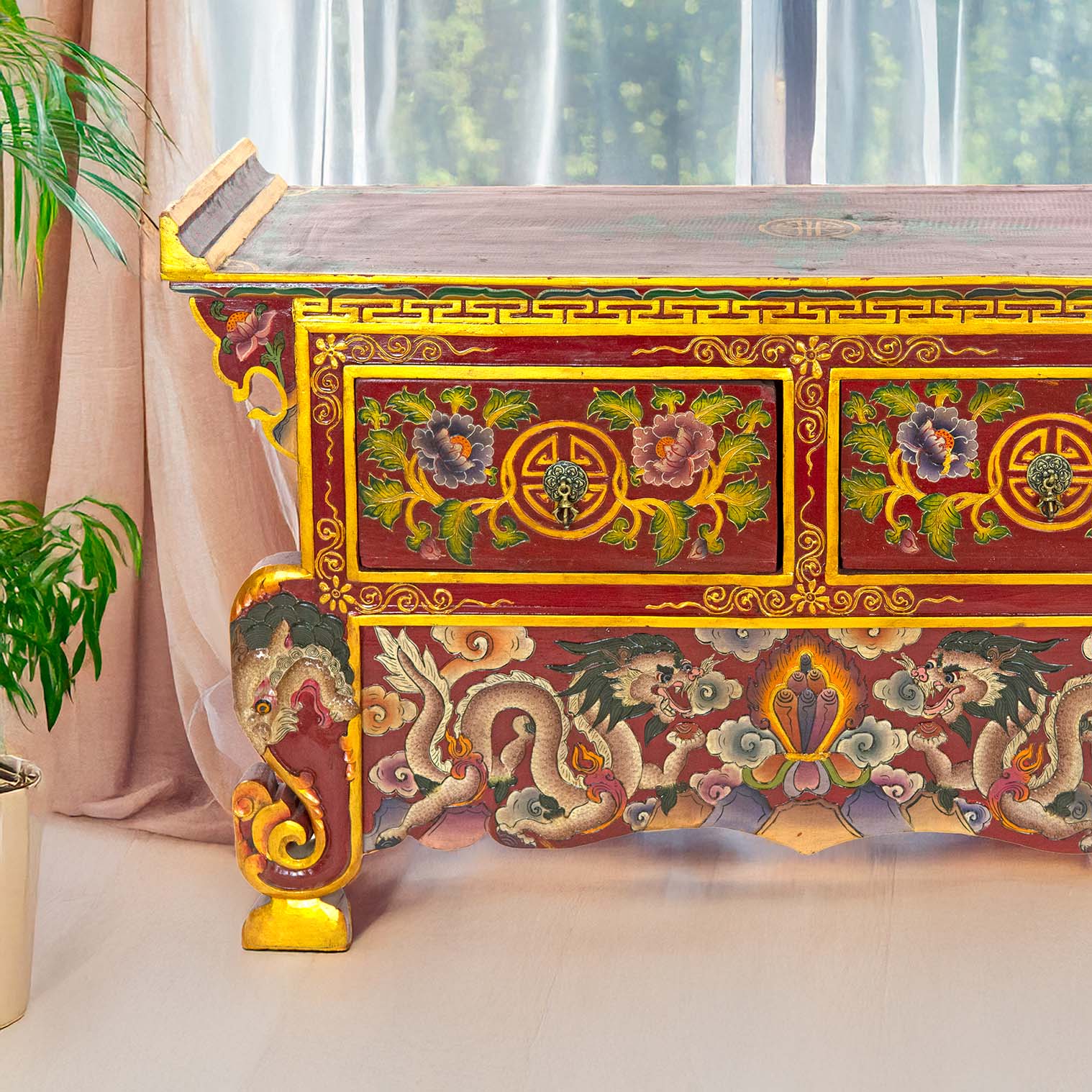 Dragons are revered in Tibetan culture as protectors of water and guardians of hidden treasures. Furniture decorated with dragon imagery is believed to bring good fortune and protection to the household. The bright colours and lively shapes reflect the joyful spirit of Himalayan art.
