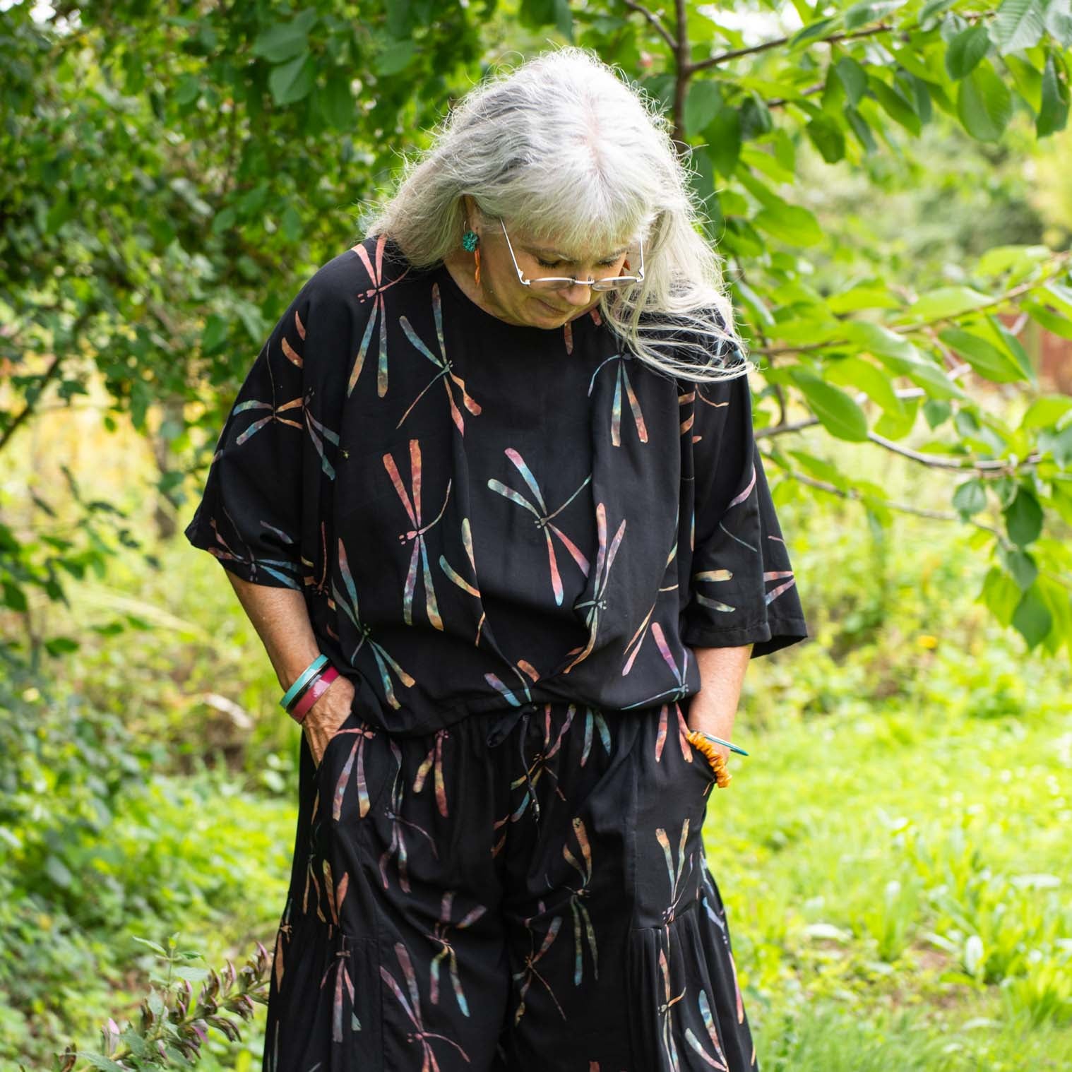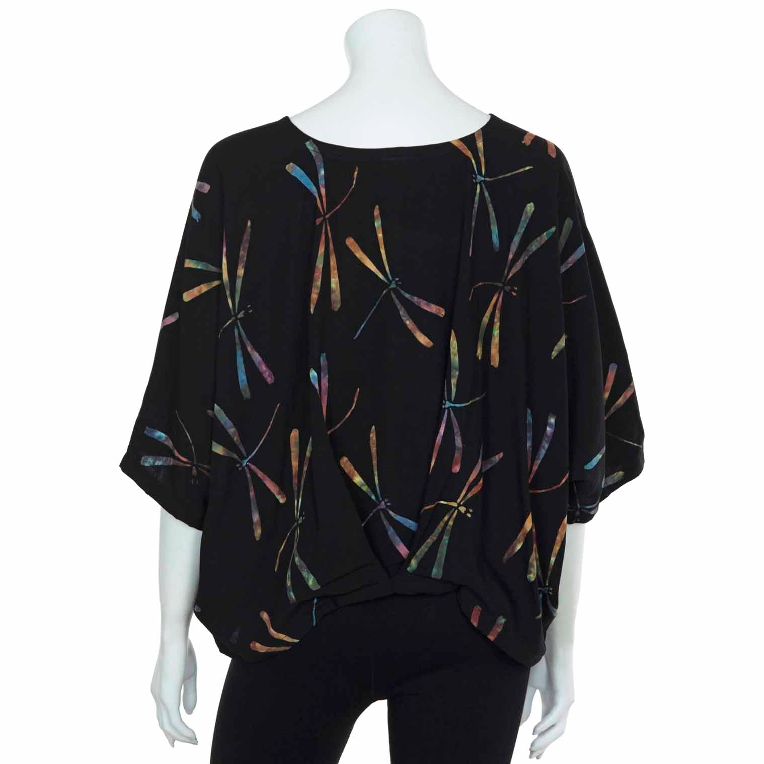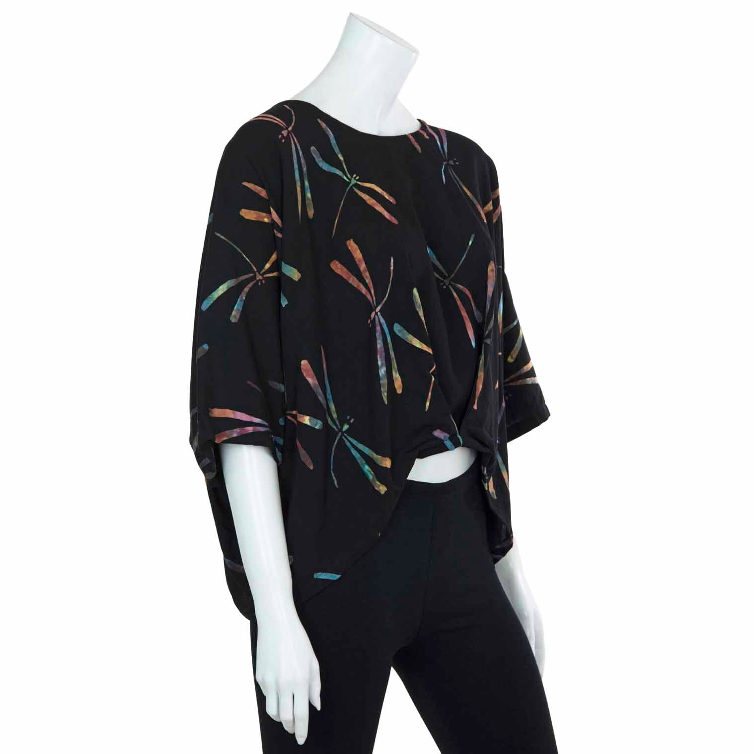 The captivating dragonfly pattern has been batik printed. This involves using traditional wax-resist dyeing techniques from Bali, Indonesia. Each piece of fabric is individually hand-dyed, resulting in unique variations in pattern and colour that make every top one-of-a-kind.