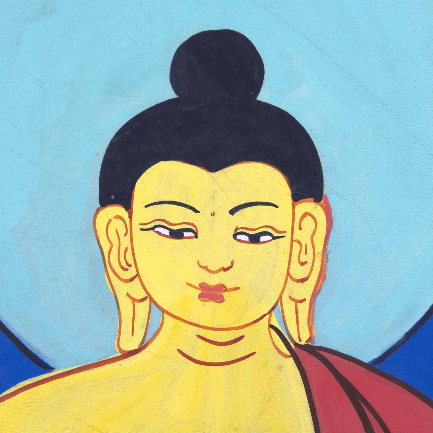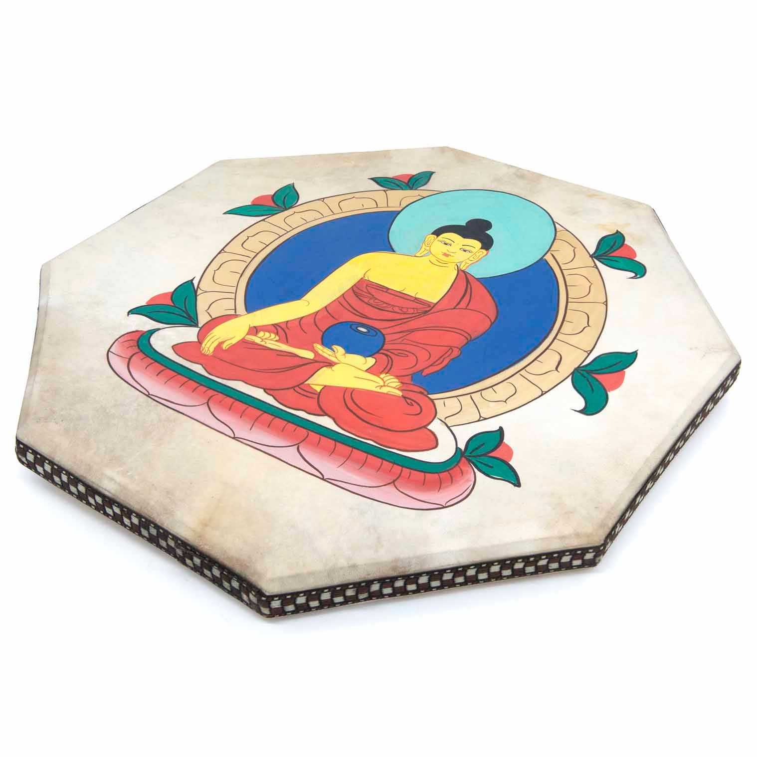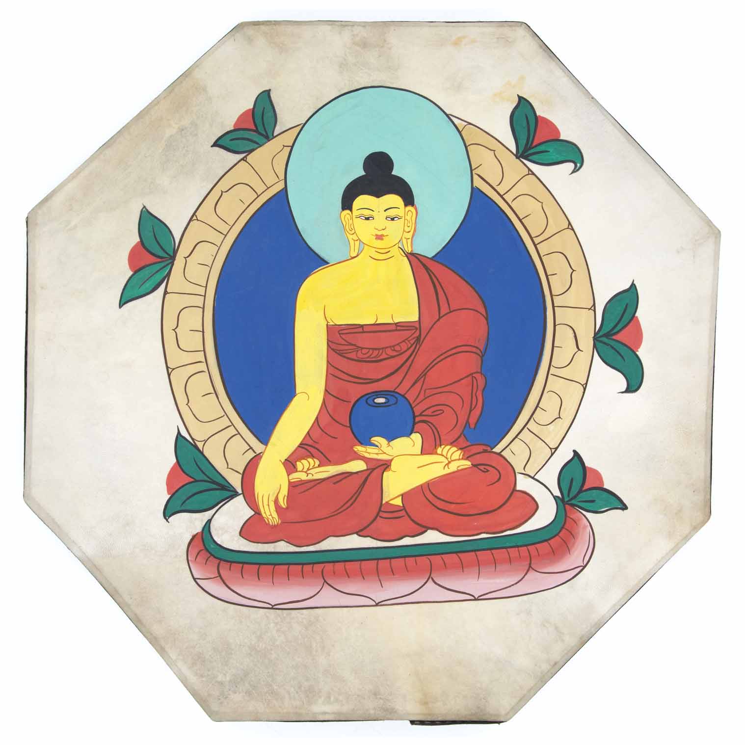 This drum is crafted by Nepali artisans using traditional techniques: a wooden frame is shaped and fitted with a taut membrane, then the surface is hand-painted with a serene Buddha image. Here, he is shown with his right hand in the Bhumisparsha Mudra (the 'earth-touching gesture') which holds deep symbolic meaning in Buddhism. It is the Mudra that Siddhartha Gautam held when he obtained enlightenment and became the Buddha. It represents him calling to earth to witness his triumph over temptation. His left hand holds an alms bowl and is in the Bhaisajya Mudra or the Dhyana Mudra. This symbolises healing, meditation, and renunciation, with the bowl representing the Buddhist monastic practice of collecting alms for sustenance.
