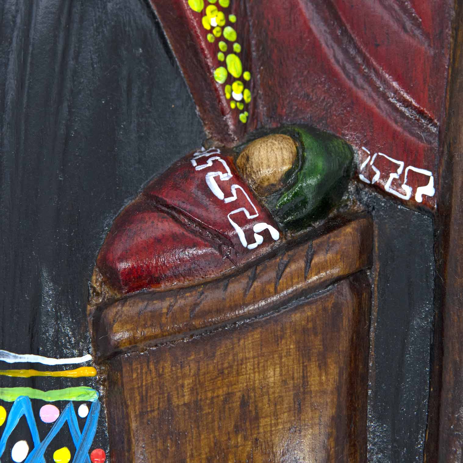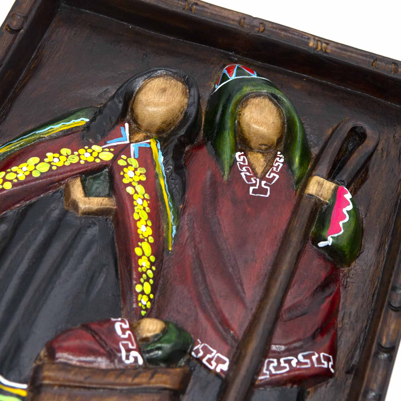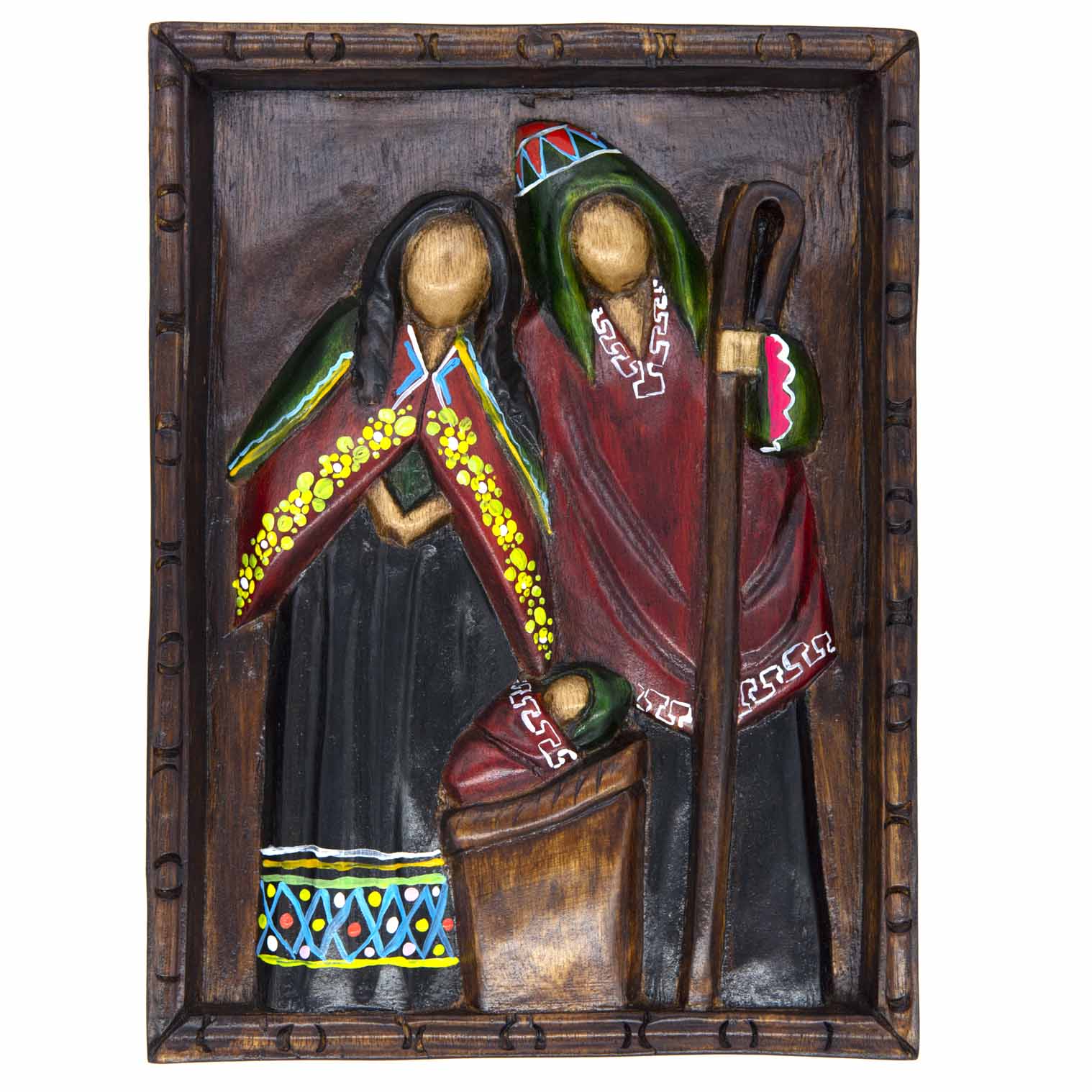 This beautifull wall plaque has been hand carved from gorgeous cedar wood and painted in rich shades of reds, greens and black. The design features Mary, Joseph and baby Jesus carved from a single piece of wood with a decorative frame. There is a hook on the back to make this stunning piece of artwork easy to display.