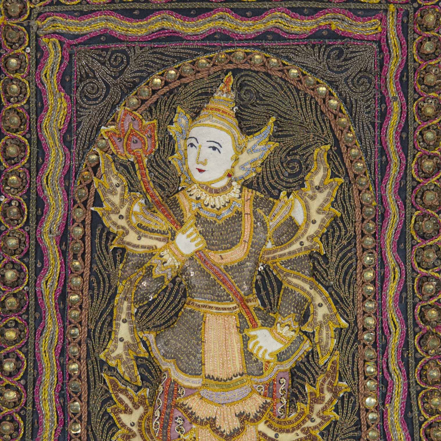 This beautiful kalaga tapestry depicts Thagyamin, the highest ranking nat in traditional Burmese Buddhist belief. A nat is a god-like spirit believed to be either a human that was defied after death, or spirits of nature. This particular nat, Thagyamin, is considered as the King of Heaven, as well as the god of lightning, thunder and rain. He is the Burmese adaptation of the Hindu deities Indra. Here he is shown holding a yak-tail fly-whisk, known as a chowri or chamara, which is a symbol of his royal power and divine status.