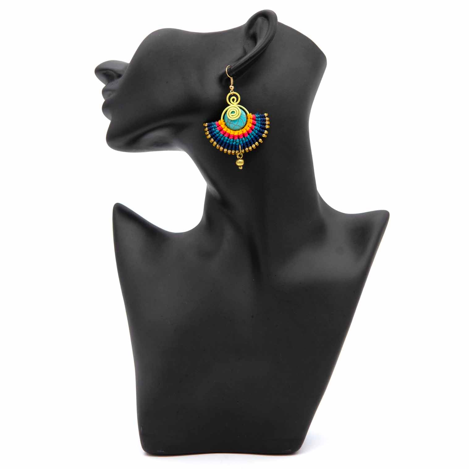 Big, bright and colourful, these earrings make quite the fashion statement! A woven macrame-like design is matched with colourful stones and golden wire-work. Each pair has gold plated hooks to complete the ultimate boho look.