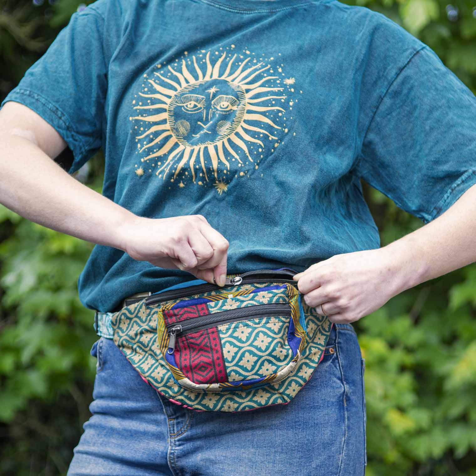 A fun style bum bag made from a patchwork of pretty sari materials. The waistband is adjustable and there is an extra secure zip compartment for easy access. This bag can also be worn across the body for extra security.